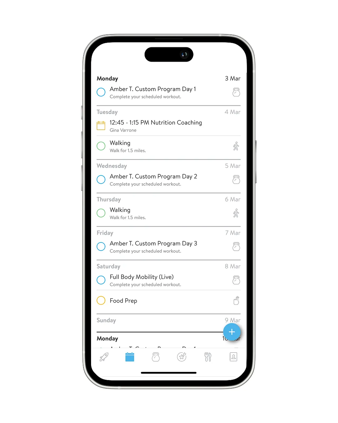 Between sessions, clients use the DF&N app to follow a personalized schedule that includes supplemental on-demand workouts, cardio training, mobility work, and rest days. Just log into the app and follow your instructions for the day.